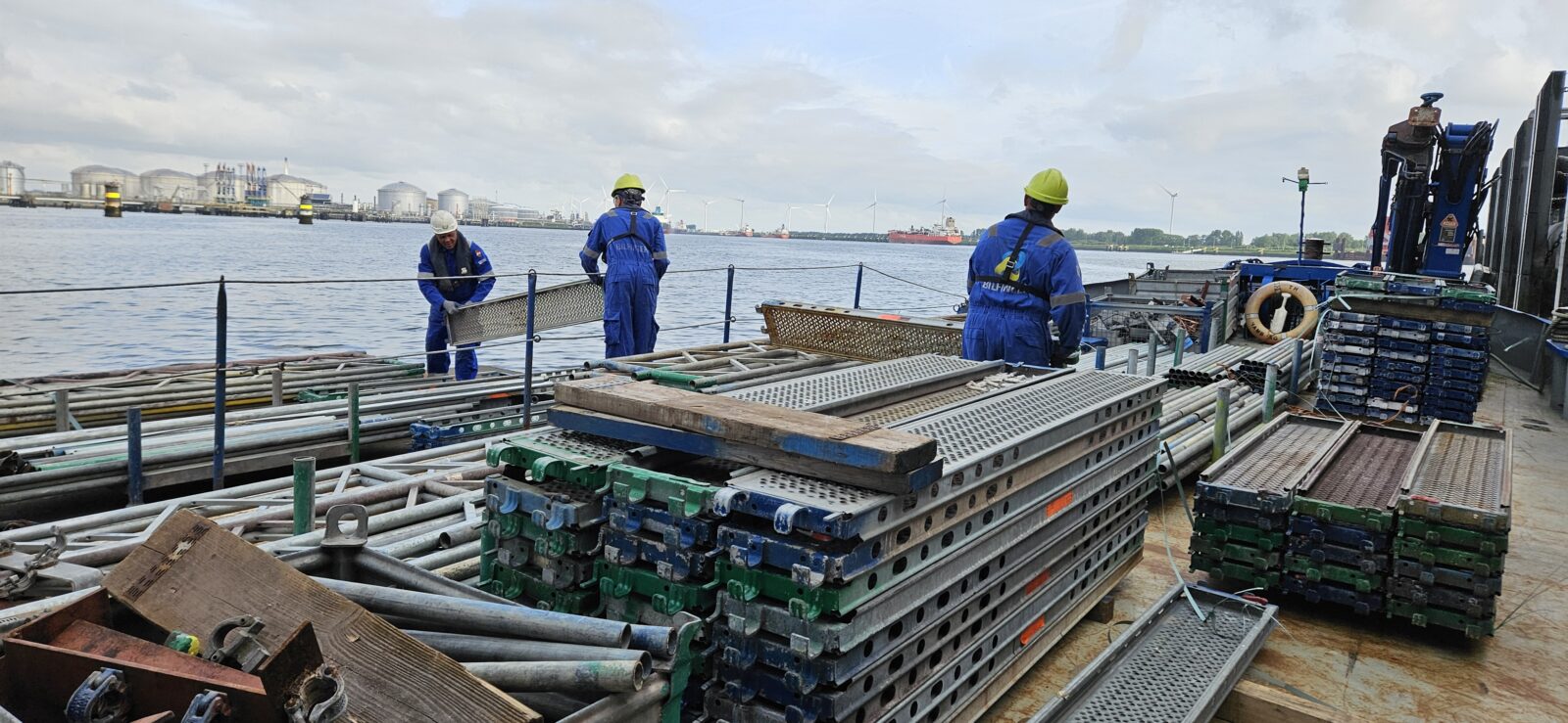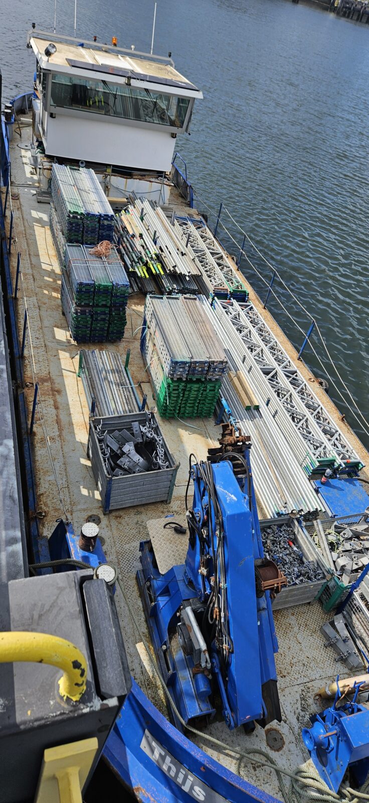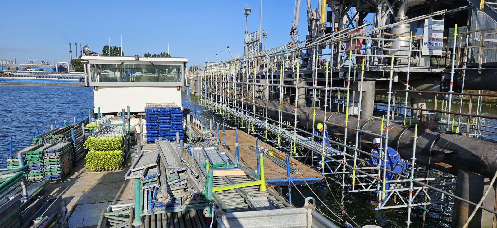 Een steiger onder een steiger of een ander object net boven het wateroppervlak bouwen: geen probleem voor Browema. Het dek van kraanschip Thijs jr biedt voldoende ruimte voor het vervoeren van steigermateriaal en een veilige ondergrond om de steigers vanaf het dek op te bouwen. En is er meer oppervlakte nodig? Dan wordt het werkschip gecombineerd met de koppelpontons of het demontabele vlot. Hiermee kan iedere vorm worden gecreëerd om de steigerbouw zo veilig en efficiënt mogelijk uit te voeren.